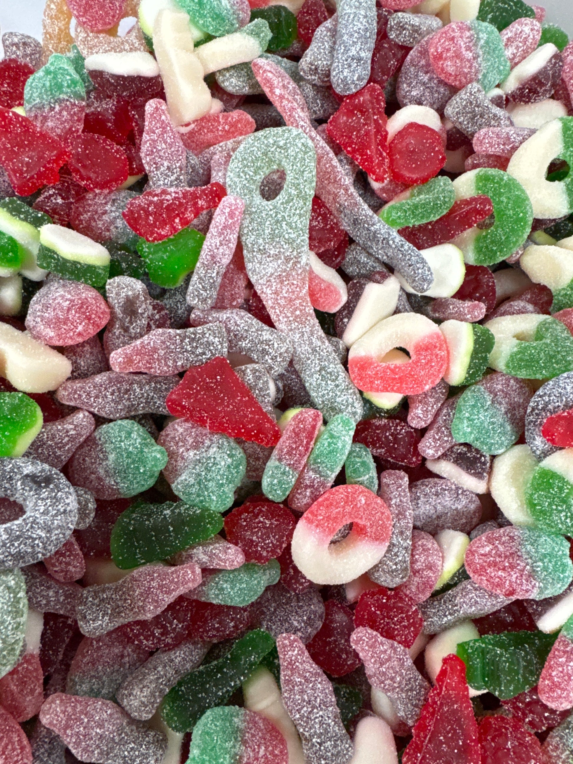 The best top ten gummies I’ve got this holiday season: 1kg of gummies themes in red and green and celebration (think sour cola bottles and sour cherry cola bottles!) plus red and green gummy rings, red gummy berries, green apple frogs and more! Giant Sour Keys included too - just for Santa to open your door with ;)